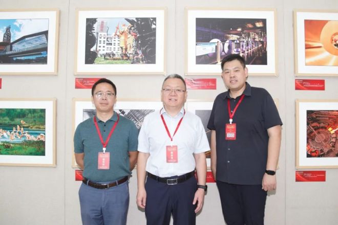 中國冶金報社黨委書記、社長范鐵軍(中),組織人事部(黨委辦公室)主任汪柏根(左),視覺中心主任顧學超在中國冶金報社參展圖片前留影