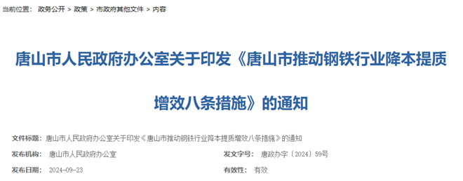 同日,唐山市人民政府網站發布了《唐山市推動鋼鐵行業降本提質增效八條措施》解讀一文。