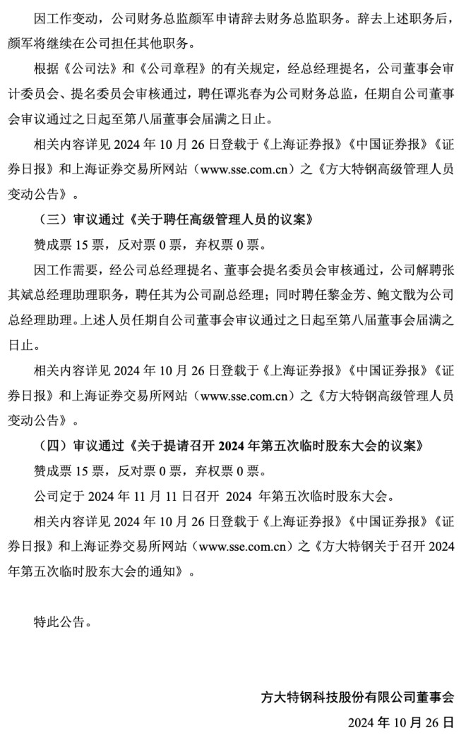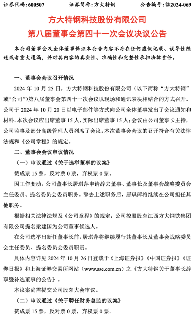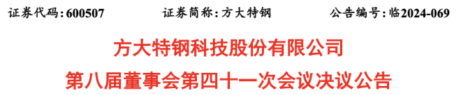 方大特鋼科技股份有限公司(以下簡稱“公司”)10月25日晚間發(fā)布《第八屆董事會第四十一次會議決議公告》(以下簡稱《公告》)。