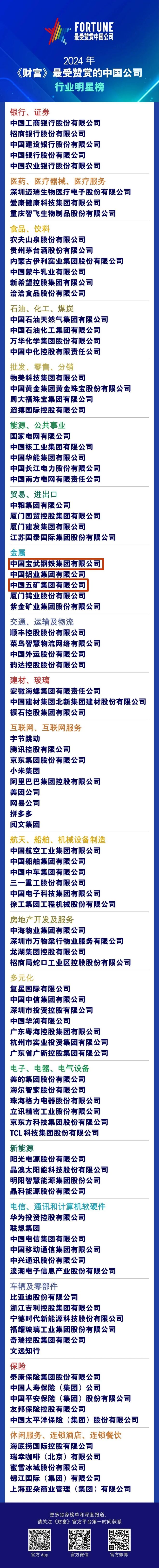 從榜單中獲悉,中國(guó)寶武鋼鐵集團(tuán)有限公司上榜2024年《財(cái)富》最受贊賞的中國(guó)公司全明星榜與行業(yè)明星榜;中國(guó)五礦集團(tuán)有限公司上榜2024年《財(cái)富》最受贊賞的中國(guó)公司行業(yè)明星榜。