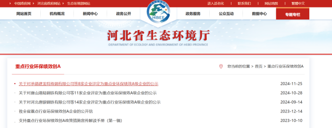 11月25日,河北省生態(tài)環(huán)境廳發(fā)布《關(guān)于對承德建龍?zhí)厥怃撚邢薰镜?家企業(yè)評定為重點(diǎn)業(yè)環(huán)保績效A級(jí)企業(yè)的公示》, 其中包括承德建龍?zhí)厥怃撚邢薰尽⒑颖比A西特種鋼鐵有限公司、唐山松汀鋼鐵有限公司、遷安市九江線材有限責(zé)任公司等4家鋼企。