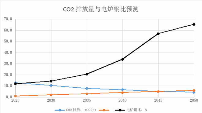 隨著鋼產(chǎn)量需求下降和廢鋼供應(yīng)量的增加,在廢鋼供應(yīng)充足的形勢下,廢鋼價格會隨之降低,廢鋼在鋼鐵行業(yè)消費量增加,特別是在2035年后電爐鋼比會快速增加,鋼鐵行業(yè)的CO2排放隨之降低。