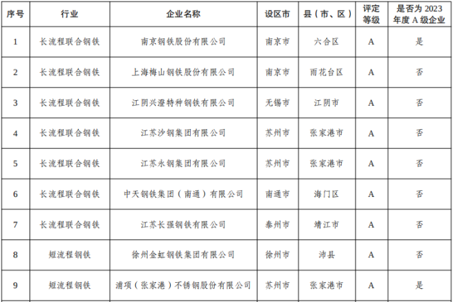 從《公示》中獲悉,包括南京鋼鐵股份有限公司、上海梅山鋼鐵股份有限公司在內的9家鋼企為重污染天氣重點行業績效評價A級企業,中天鋼鐵集團有限公司等12家鋼廠為B(含B-)級企業。