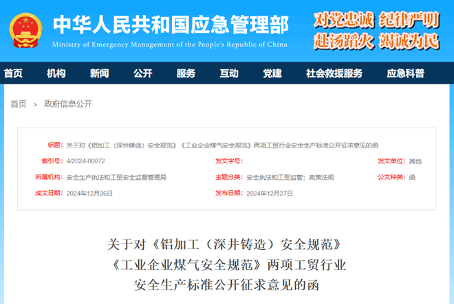 12月27日,應(yīng)急管理部網(wǎng)站發(fā)布了關(guān)于對(duì)《鋁加工(深井鑄造)安全規(guī)范》《工業(yè)企業(yè)煤氣安全規(guī)范》兩項(xiàng)工貿(mào)行業(yè)安全生產(chǎn)標(biāo)準(zhǔn)公開征求意見的函。