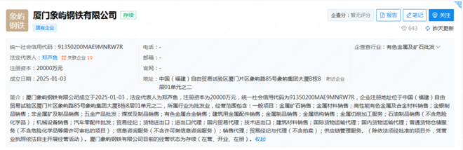 據企查查顯示,廈門象嶼鋼鐵有限公司于1月3日成立,法定代表人為鄭蘆魚,注冊資本為20000萬元。