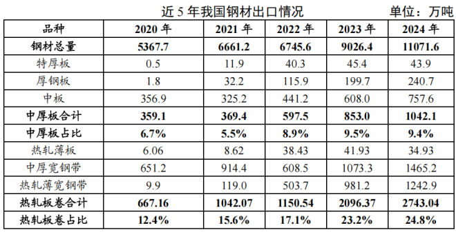 近五年,我國鋼材出口量持續(xù)增長態(tài)勢。2024年,我國鋼材出口總量達到11071.55萬噸,同比增長22.7%,較2020年增長106.3%。其中,2024年中厚板出口總量1042.10萬噸,同比增長22.2%,占出口鋼材總量的9.4%;熱軋板卷出口總量2743.04萬噸,同比增長30.8%,占出口鋼材總量的24.8%。