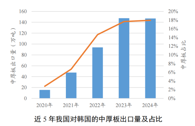 近五年,我國對韓國的鋼材出口呈波動增長態(tài)勢,其中中厚板占比呈穩(wěn)定增長態(tài)勢。2024年,我國對韓國的鋼材出口總量818.75萬噸,同比下降1.9%,較2020年增長46.9%;其中,對韓中厚板出口量147萬噸,同比基本持平,但比2020年增長846.6%;占出口韓國鋼材總量的18%,占我國中厚板出口量的14.1%。