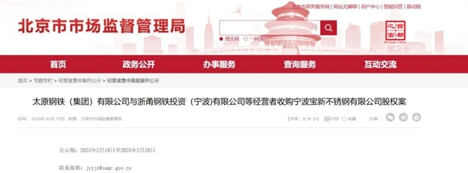 近日,北京市市場監督管理局發布《太原鋼鐵(集團)有限公司與浙甬鋼鐵投資(寧波)有限公司等經營者收購寧波寶新不銹鋼有限公司股權案》公示。