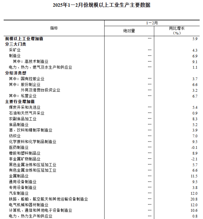 分行業看,1-2月份,41個大類行業中有36個行業增加值保持同比增長。其中,煤炭開采和洗選業增長5.4%,石油和天然氣開采業增長0.9%,農副食品加工業增長8.3%,酒、飲料和精制茶制造業增長3.9%,紡織業增長7.0%,化學原料和化學制品制造業增長9.5%,非金屬礦物制品業下降2.1%,黑色金屬冶煉和壓延加工業增長5.7%,有色金屬冶煉和壓延加工業增長6.6%,通用設備制造業增長9.5%,專用設備制造業增長3.8%,汽車制造業增長12.0%,鐵路、船舶、航空航天和其他運輸設備制造業增長20.8%,電氣機械和器材制造業增長12.0%,計算機、通信和其他電子設備制造業增長10.6%,電力、熱力生產和供應業增長0.8%。
