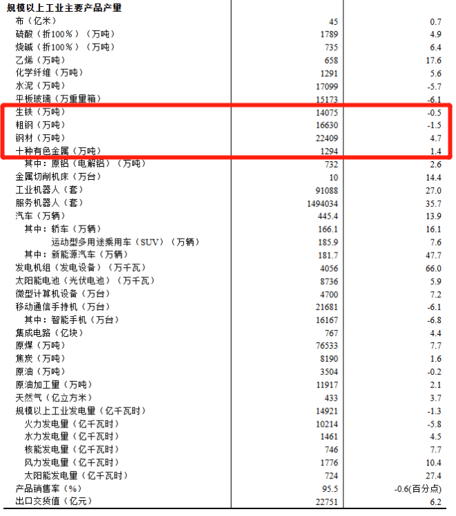 分產品看,1—2月份,規模以上工業623種產品中有378種產品產量同比增長。其中,鋼材22409萬噸,同比增長4.7%;水泥17099萬噸,下降5.7%;十種有色金屬1294萬噸,增長1.4%;乙烯658萬噸,增長17.6%;汽車445.4萬輛,增長13.9%,其中新能源汽車181.7萬輛,增長47.7%;發電量14921億千瓦時,下降1.3%;原油加工量11917萬噸,增長2.1%。