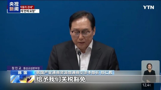 韓國產業通商資源部通商交涉本部長 鄭仁教:我們已向美國貿易代表辦公室提出要求,給予我們關稅豁免,或者至少給予我們非歧視待遇。