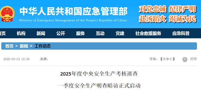 近日,2025年度中央安全生產(chǎn)考核巡查一季度安全生產(chǎn)明查暗訪正式啟動。由國務(wù)院安委會有關(guān)成員單位負(fù)責(zé)同志帶隊的22個中央安全生產(chǎn)考核巡查組陸續(xù)進(jìn)駐31個省、自治區(qū)、直轄市和新疆生產(chǎn)建設(shè)兵團(tuán),開展一季度安全生產(chǎn)明查暗訪。