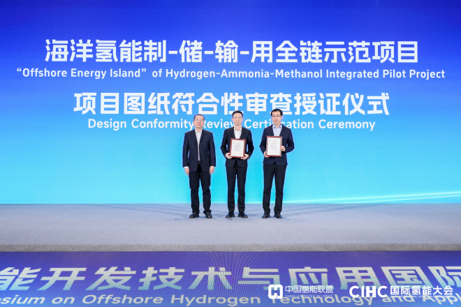 研討會上,中國氫能聯(lián)盟秘書長、國家能源集團(tuán)氫能事業(yè)部主任、國華投資(氫能公司)總經(jīng)理劉瑋作了《海洋氫能發(fā)展展望及“海上氫氨醇一體化能源島示范”實(shí)踐》開幕報告。中國船級社(CCS)海工技術(shù)中心副主任李紅濤為國家能源集團(tuán)氫能科技有限責(zé)任公司、煙臺中集來福士海洋工程有限公司和國能氫創(chuàng)科技(北京)有限公司聯(lián)合研發(fā)的海洋氫能制-儲-輸-用全鏈?zhǔn)痉俄?xiàng)目頒發(fā)圖紙符合性證書。