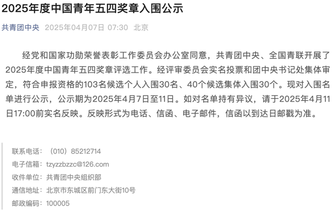 4月7日,公眾號(hào)共青團(tuán)中央發(fā)布《2025年度中國青年五四獎(jiǎng)?wù)氯雵尽贰?/div>