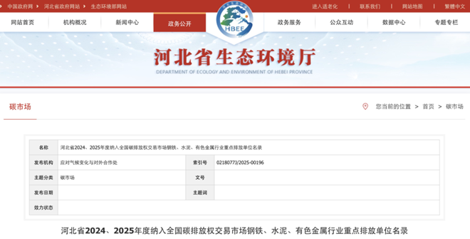 近日,河北省生態環境廳網站發布了《河北省2024、2025年度納入全國碳排放權交易市場鋼鐵、水泥、有色金屬行業重點排放單位名錄》。