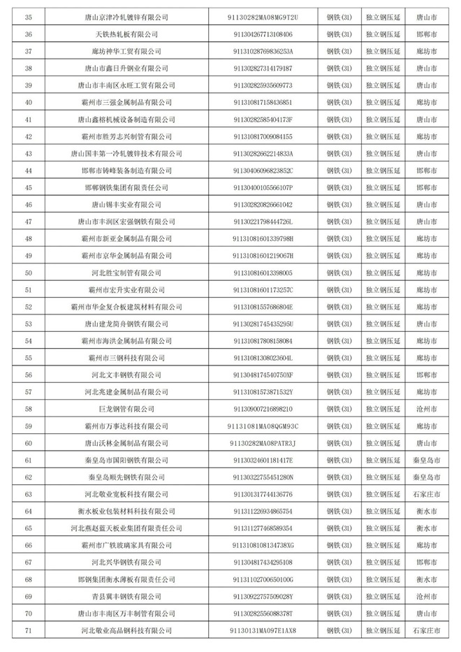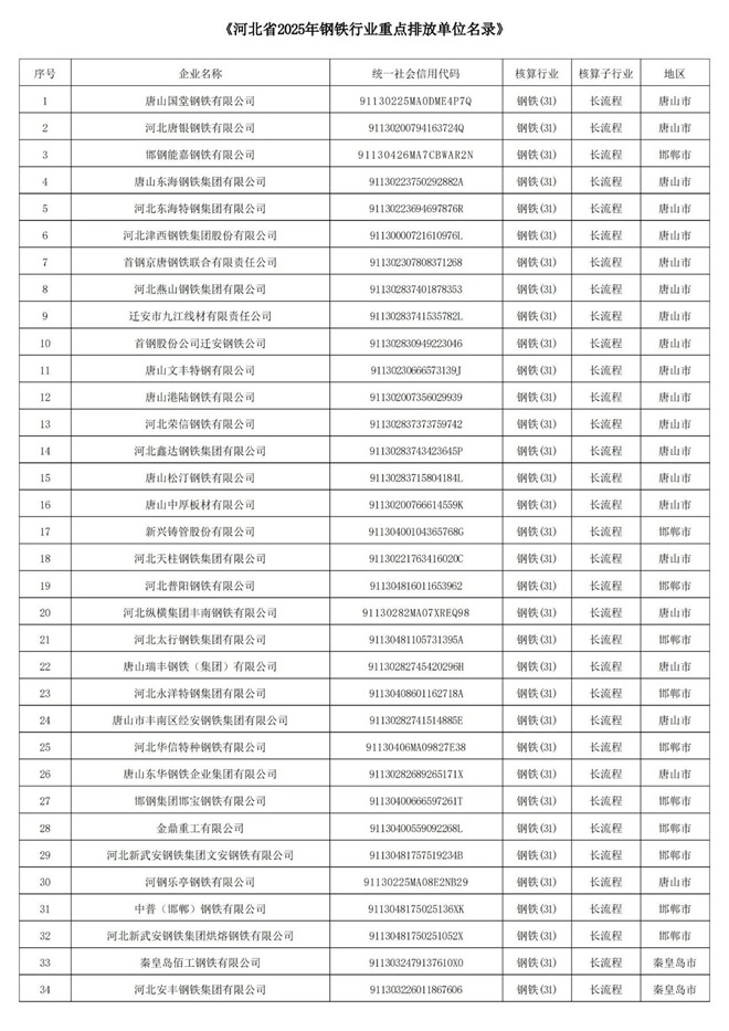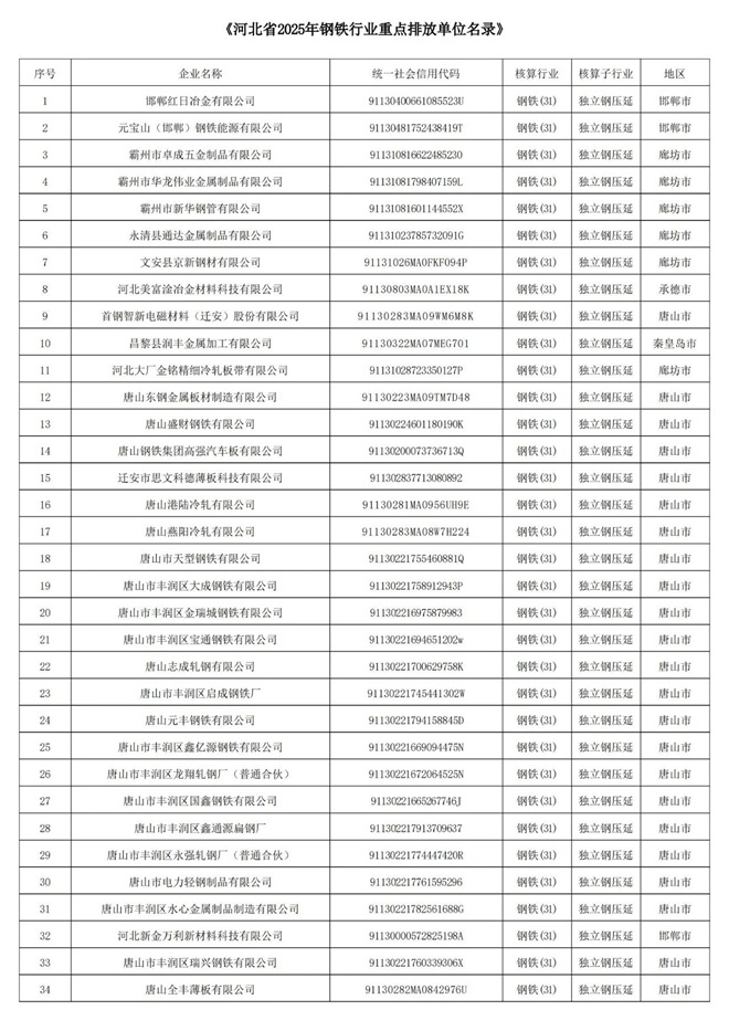 根據《碳排放權交易管理暫行條例》《生態環境部辦公廳關于做好2025年全國碳排放權交易市場有關工作的通知》(環辦氣候函〔2025〕140號)有關規定,現將河北省2024、2025年度納入全國碳排放權交易市場鋼鐵、水泥、有色金屬行業重點排放單位名錄公布如下。