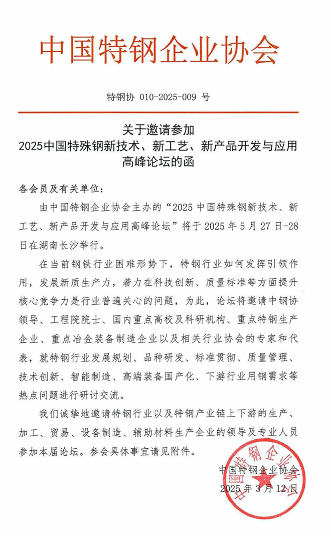 “2025中國特殊鋼新技術(shù)、新工藝、新產(chǎn)品開發(fā)與應(yīng)用高峰論壇”邀請函