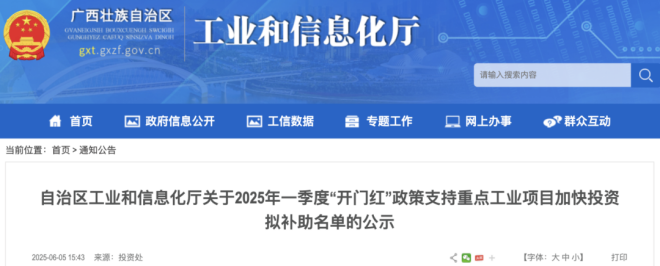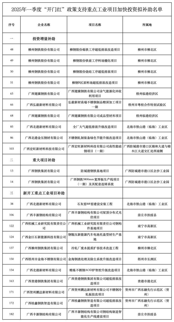 日前,廣西壯族自治區工業和信息化廳公布2025年一季度“開門紅”政策支持重點工業項目加快投資擬補助名單。