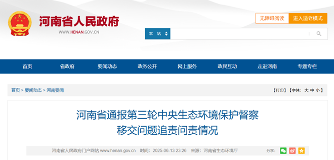 6月13日,河南省人民政府網站發布《河南省通報第三輪中央生態環境保護督察移交問題追責問責情況》一文。