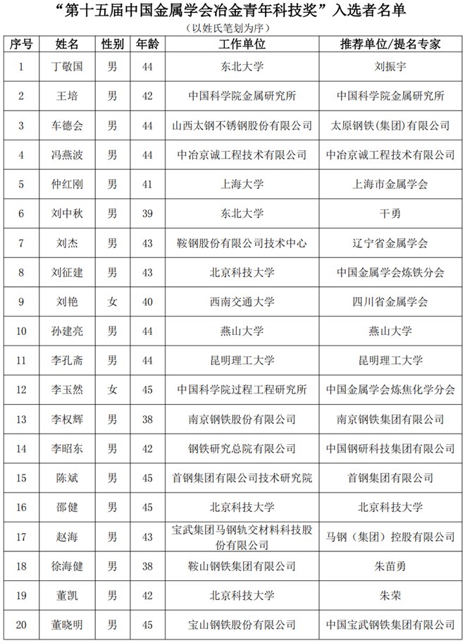 按照《中國金屬學(xué)會冶金青年科技獎獎勵章程》,第十五屆中國金屬學(xué)會冶金青年科技獎經(jīng)單位推薦/專家提名、資格審查、初評、復(fù)評,最終有20名候選人入選。
