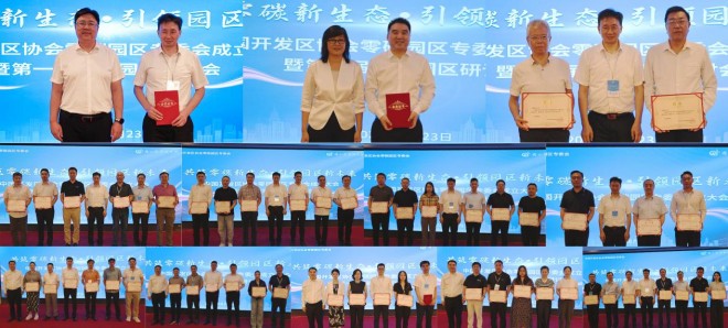 中國開發區協會常務副會長兼秘書長王磊、中國開發區協會副秘書長曾召賀、國合能源研究院院長王進、南京市溧水區原副區長顧順清為發起單位及首批委員單位頒發證書,國合能源研究院院長王進為首席專家及研究專家頒發聘書。