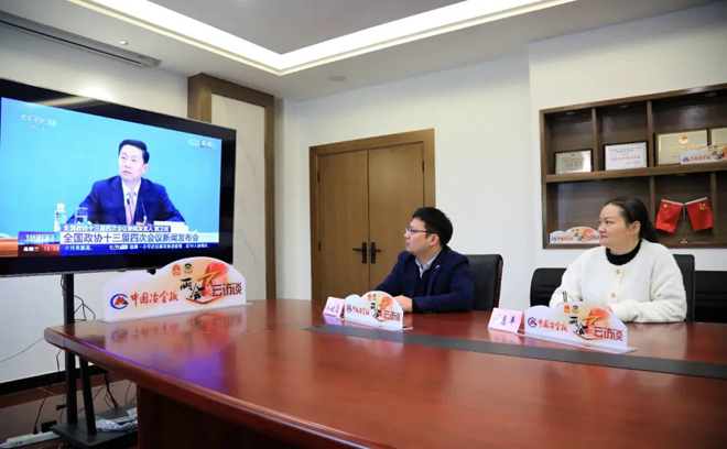 3月3日下午,全國(guó)政協(xié)十三屆四次會(huì)議新聞發(fā)布會(huì)在北京召開。圖為中國(guó)冶金報(bào)社兩會(huì)報(bào)道組記者通過網(wǎng)絡(luò)視頻“云參會(huì)”。