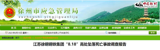 近日,徐州市應(yīng)急管理局發(fā)布《江蘇徐鋼鋼鐵集團(tuán)“8.18”高處墜落死亡事故調(diào)查報(bào)告》(以下簡稱“《調(diào)查報(bào)告》”)。