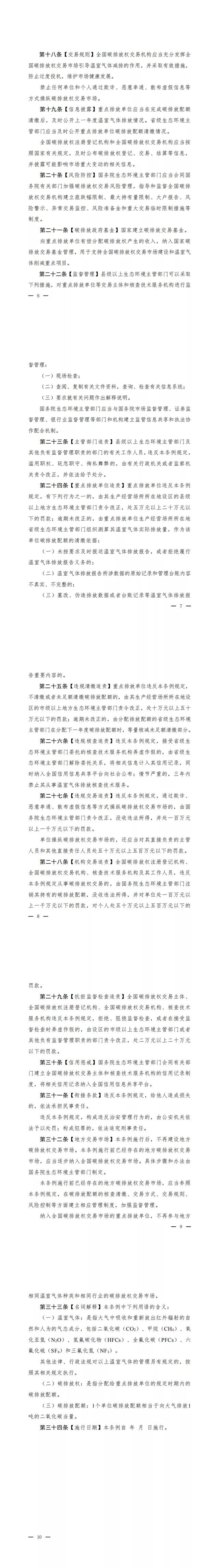 此外,重點排放單位違反條例相關規定時,由其生產經營場所所在地設區的縣級以上地方生態環境主管部門責令改正,處5萬元以上20萬元以下罰款;逾期未改正的,由重點排放單位生產經營場所所在地省級生態環境主管部門組織測算其溫室氣體實際排放量,作為該單位碳排放配額的清繳依據;通過欺詐、惡意串通、散布虛假信息等方式操縱碳排放權交易市場的,由國務院生態環境主管部門責令改正,沒收違法所得,并處100萬元以上1000萬元以下的罰款等。相關信用記錄納入全國信用信息共享平臺。