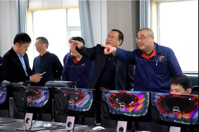圖為陳玉千一行調研晉南鋼鐵1860立方米高爐加氫冶煉工藝。