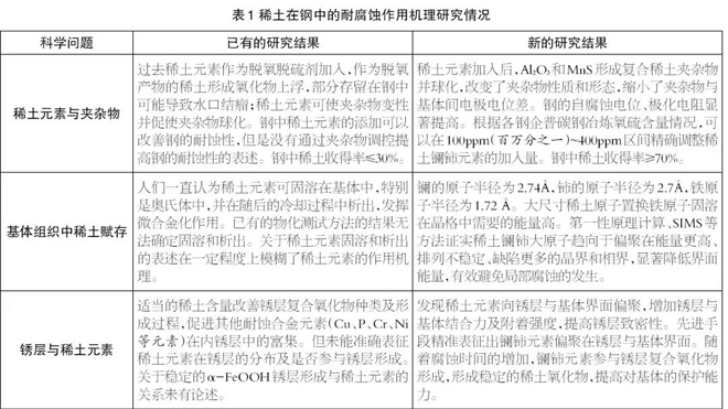 基于此,上海大學高性能鋼鐵材料團隊應用高豐度鑭鈰稀土資源,通過多形合金化原理與技術,明確了稀土鑭鈰元素在普碳鋼中的賦存與蹤跡,以及稀土在鋼中的耐腐蝕作用機理,即鑭鈰元素可改變夾雜物性質和形態,縮小夾雜物與基體的電極電位差,避免點蝕發生;偏聚于微觀組織界面,降低了界面能,避免表面和局部腐蝕發生;可促進α-FeOOH穩定銹層形成,形成致密的表面銹層組織,有效降低腐蝕速率。(見圖2、表1)