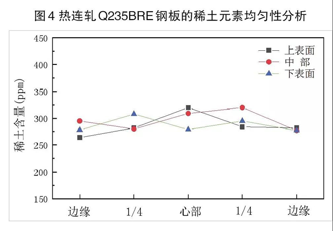 基于對稀土元素在鋼中作用機理的研究結果,上海大學高性能鋼鐵材料團隊創新研發了保護性稀土合金加入技術,依托多個鋼企的不同鋼材生產流程,經過多次工業試驗,最終確定了最佳的稀土合金加入工藝。該團隊在不改變現行鋼鐵生產工藝流程的條件下,將稀土合金化設備嵌入流程,操作簡單易行,成本低廉,稀土收得率高且穩定均勻,形成了穩定的低成本高收得率稀土鑭鈰多形合金化加入方法,避免了連鑄水口結瘤,穩定實現多爐連澆,在連鑄坯中稀土元素分布均勻。(見圖4)