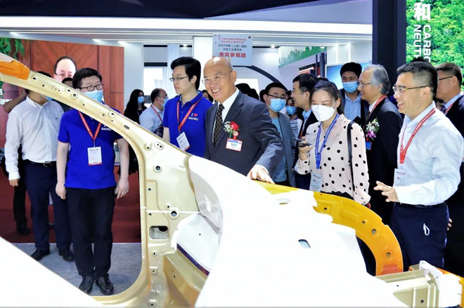 在引導(dǎo)員的帶領(lǐng)下,何文波一行來到了這次展覽會最大展位——展位占地面積達510平方米的中國寶武展臺。首先映入眼簾的就是靚麗的白車身。何文波撫摸著白車身自豪地說道,中國寶武負責(zé)了白車身的所有面板,所有材料都用上了,中信泰富特鋼則負責(zé)了車體內(nèi)部變速箱、凸輪軸等零部件用鋼。“這都是寶貴的財富?!彼Φ?。