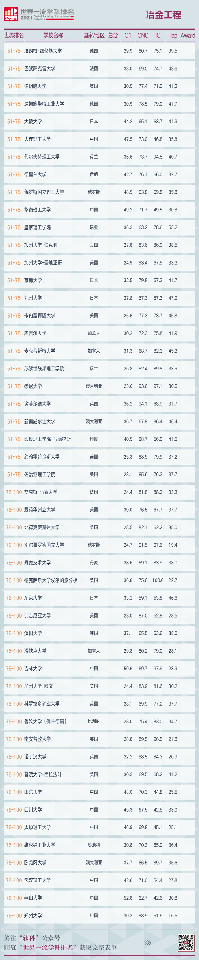5月26日,高等教育評價專業(yè)機構(gòu)軟科發(fā)布了2021“軟科世界一流學科排名”(ShanghaiRanking's Global Ranking of Academic Subjects)。冶金工程學科共有200所高校上榜,中國繼去年后,又一次包攬全球前五強,排名依次為北京科技大學、中南大學、東北大學(沈陽)、西北工業(yè)大學、上海交通大學。前10名中有6家中國高校上榜,比去年增加1家,哈爾濱工業(yè)大學為新晉十強。