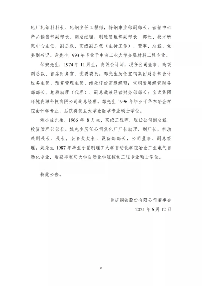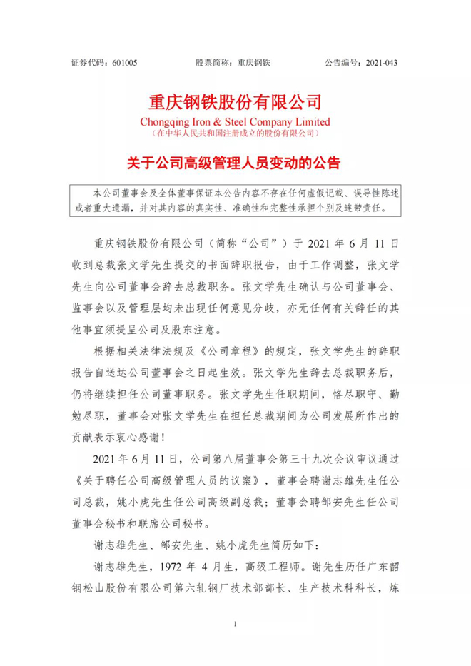 6月11日傍晚,重慶鋼鐵發(fā)布《關于公司高級管理人員變動的公告》,由于工作調整,公司總裁張文學辭去重慶鋼鐵股份有限公司總裁一職,由原韶鋼松山總裁謝志雄擔任公司總裁。同時,董事會聘任姚小虎任公司高級副總裁,鄒安任公司董事會秘書和聯(lián)席公司秘書。