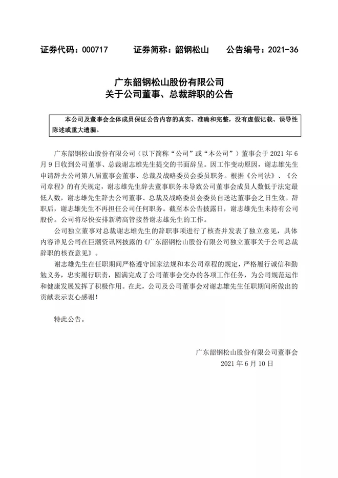 6月9日,韶鋼松山曾經(jīng)發(fā)布公告,因工作變動原因,謝志雄申請辭去公司第八屆董事會董事、總裁及戰(zhàn)略委員會委員職務,不再擔任公司任何職務,公司將盡快安排新聘高管接替謝志雄的工作。