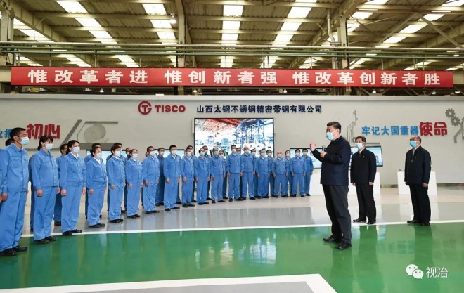 2020年5月11日至12日,中共中央總書記、國家主席、中央軍委主席習近平在山西考察。這是5月12日上午,習近平在太鋼不銹鋼精密帶鋼有限公司生產車間考察時,同企業職工親切交流。(新華社記者 謝環馳 攝)