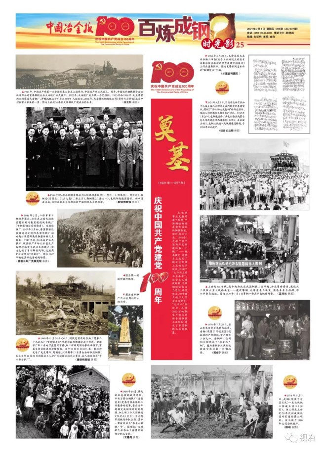 在中國共產黨成立100周年之際,中國冶金報特推出《時光影——建黨百年·百圖鋼鐵》欄目的“七一”特輯,并以《關懷》、《奠基》(1921年—1977年)、《騰飛》(1978年—2011年)、《奮進》(2012年至今)、《擔當》(2012年至今)5個主題篇章呈現,用視覺影像講述中國鋼鐵百年故事,以饗讀者!
