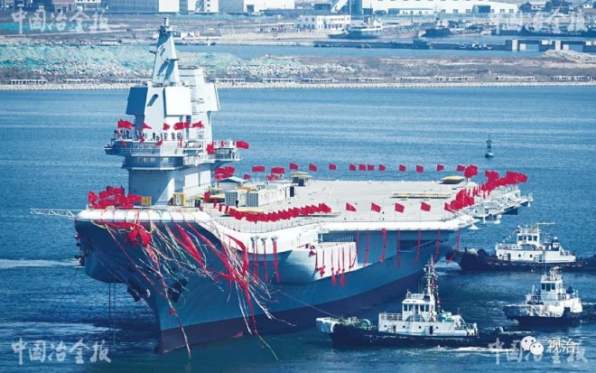 2013年8月,鞍鋼完成了建造首艘國產航母所需的甲板鋼、球扁鋼等關鍵型號鋼材的生產,為國產航母建造提供了70%的航母專用鋼材。圖為2017年4月,我國首艘國產航母順利下水。(劉德斌 攝)
