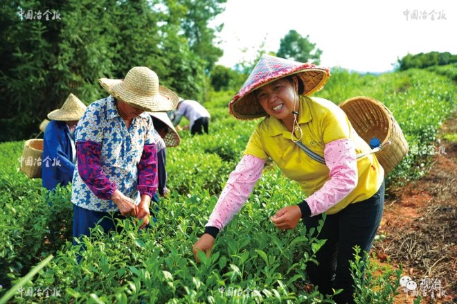 2016年以來,在中國寶武韶鋼松山的對口幫扶下,廣東省韶關南雄市南畝鎮樟屋村大力發展茶葉種植、茶葉育苗、水稻種植、辣椒種植等特色產業,實現由“輸血”到“造血”的轉變。該村集體收入從2015年的2.3萬元增加至2020年的32.27萬元。圖為該村村民正在采茶。(陳立新 攝)