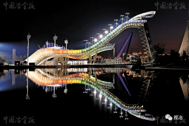 2020年11月27日,作為北京冬奧會北京賽區首個建成的新比賽場館,首鋼滑雪大跳臺正式交付使用。據悉,首鋼滑雪大跳臺是冬奧歷史上首個永久保留和使用的同類比賽場地,主要由賽道、裁判塔和看臺區域三部分組成。圖為首鋼滑雪大跳臺夜景。(孫力 攝)
