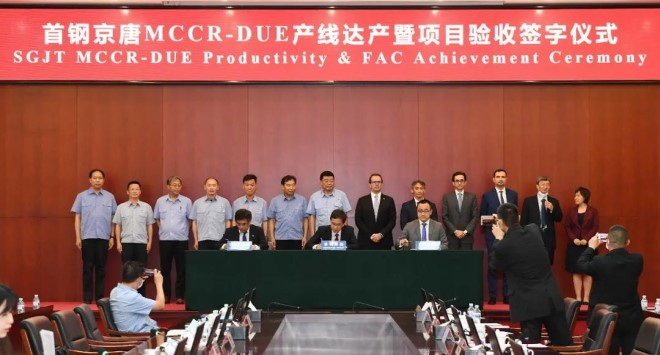 7月2日,首鋼京唐MCCR-DUE產線達產暨項目驗收簽字儀式在北京首鋼園區舉行,標志著世界首條多模式全連續鑄軋生產線全面達產。該產線集成了當今薄板坯連鑄和熱軋的最新技術,其建成和達產對第三代薄板坯連鑄連軋工藝技術的發展具有里程碑式的意義。