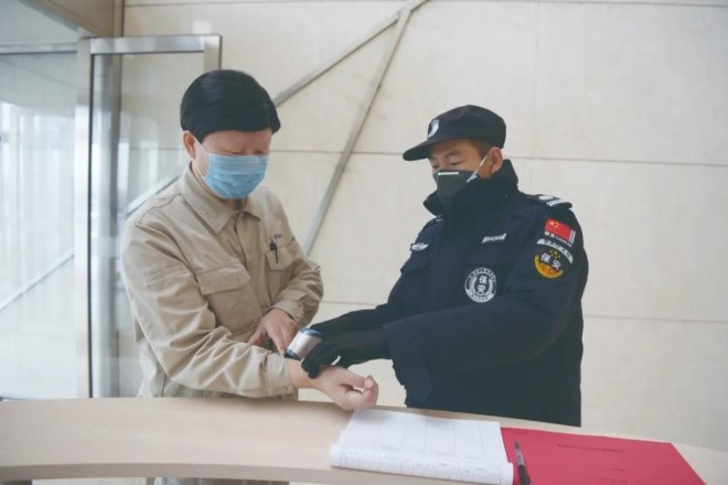 警衛(wèi)人員對上班職工進(jìn)行體溫檢測。