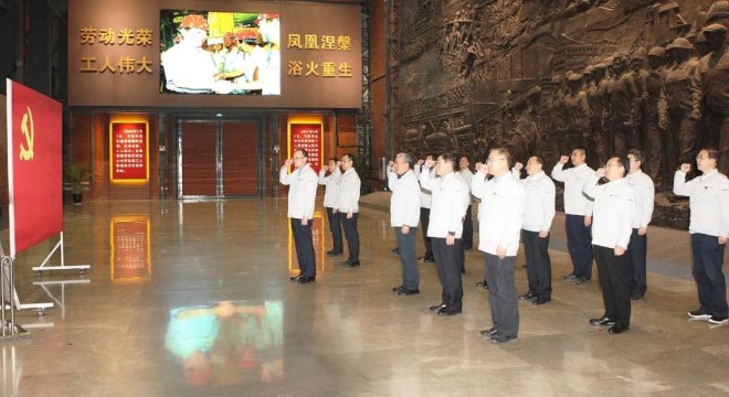 鞍鋼集團(tuán)黨史學(xué)習(xí)教育專題讀書班學(xué)員到鞍鋼博物館重溫入黨誓詞。