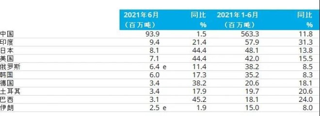 2021年1月-6月份粗鋼產(chǎn)量累計(jì)前十位的國家