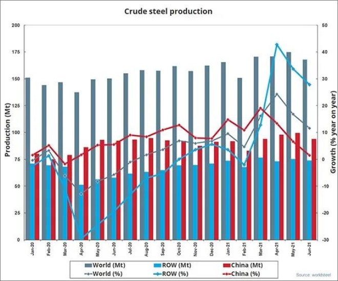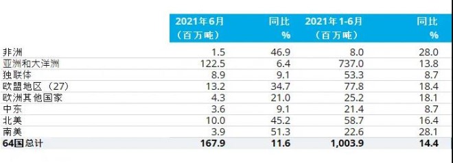 2021年6月份,全球64個納入世界鋼鐵協(xié)會統(tǒng)計(jì)國家的粗鋼產(chǎn)量為1.679億噸,同比增長11.6%。