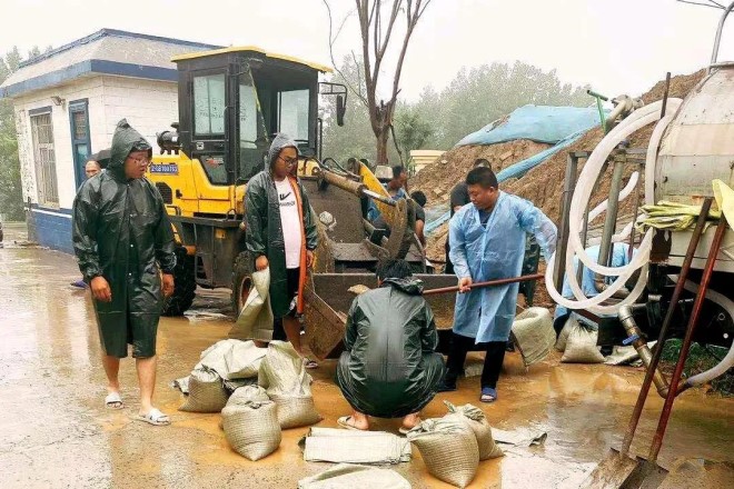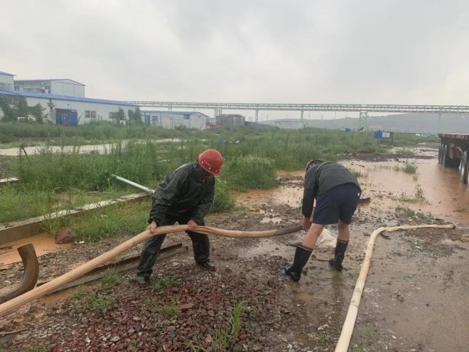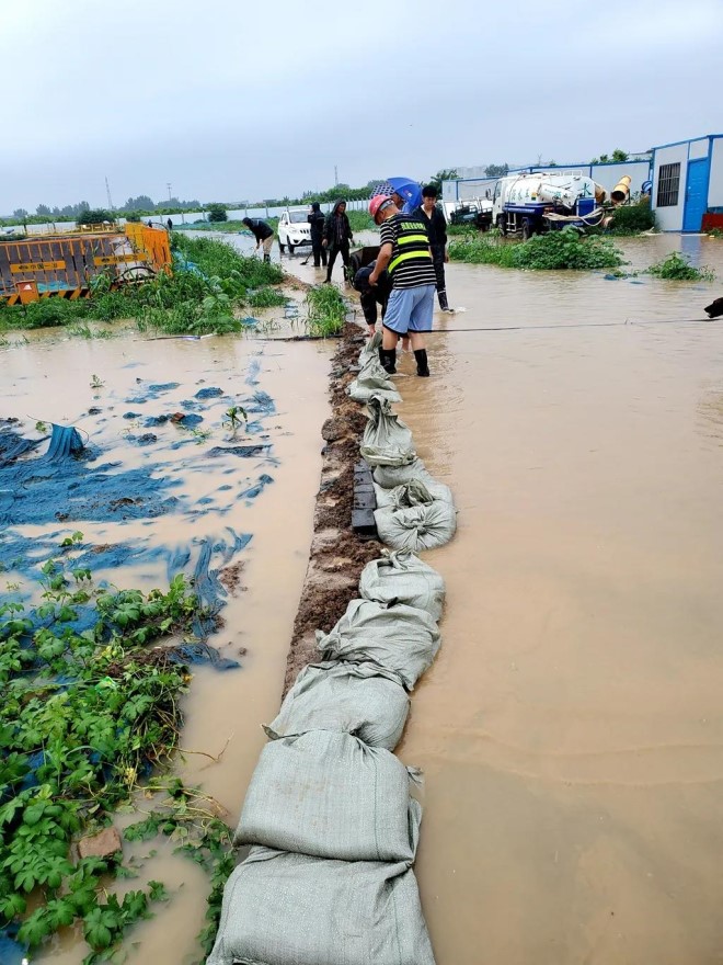 中冶天工迅速成立河南片區(qū)防汛應急現(xiàn)場指揮部,第一時間對河南片區(qū)項目防汛抗災工作進行安排部署,并建立防汛應急工作群,以便于實時跟蹤對接現(xiàn)場情況,全力確保項目人員及周邊群眾的生命安全。河南洛陽孟津項目部緊急采購了止水沙袋、排水泵、排水帶、雨衣、雨鞋等應急物資,發(fā)出請戰(zhàn)書,隨時做好應急救援準備;周口片區(qū)各項目部緊急成立24小時在崗值守搶險救援小隊,從嚴全面持續(xù)開展安全隱患排查和處置工作,以飽滿的精神、昂揚的斗志備戰(zhàn)各項工作,共同守護人民群眾生命財產安全;河南鶴壁碧桂園項目第一時間成立黨員突擊隊,面對鶴壁浚縣及周邊相鄰村鎮(zhèn)衛(wèi)河鶴壁新鎮(zhèn)段決堤,河水涌入附近村莊,項目突擊隊加緊時間加工制作鋼筋籠,圍堵堤口,最大程度阻止泄洪,保障當?shù)鼐用竦纳敭a安全。