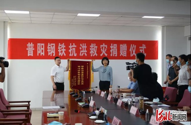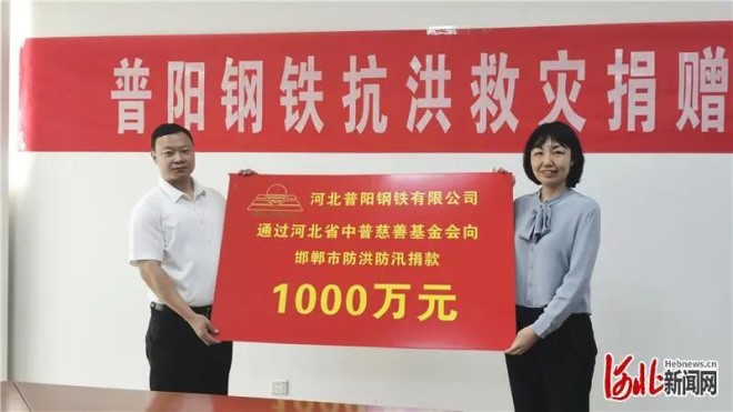8月4日上午,河北普陽鋼鐵有限公司向河北省邯鄲市捐款1000萬元,用于幫助當地恢復生產和災后重建。