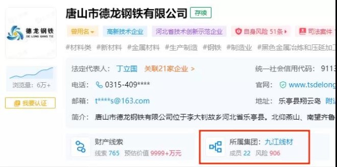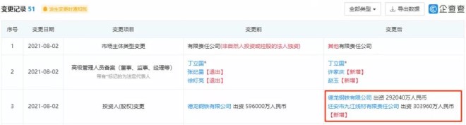 企查查網(wǎng)站信息顯示,唐山德龍目前所屬集團(tuán)為九江線材。8月2日,唐山德龍實(shí)現(xiàn)了投資人(股權(quán))變更——九江線材出資303960萬元人民幣,股權(quán)占比為51%;德龍鋼鐵有限公司出資292040萬元人民幣,股權(quán)占比為49%。