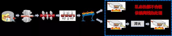 在國民經濟建設中,熱軋無縫鋼管是一類重要的鋼材門類,更是油氣鉆采、裝備制造等關鍵領域不可替代的高安全性基礎原材料。熱軋無縫鋼管生產過程具有兩個典型特征,一是實心管坯穿孔軋制過程變形阻力大,通常需要在比其它熱軋鋼材更高的變形溫度下完成成形過程;二是軋后鋼管在空氣中冷卻,缺乏有效的冷卻路徑控制。這導致熱軋無縫鋼管長期以來缺乏有效的在線組織性能調控手段,熱軋態產品強度低、韌性差,合格率低(以最為基礎的Q235鋼為例,30mm以上壁厚產品軋態性能合格率不足60%),產品性能提升只能依靠添加更多的合金元素及后續離線熱處理(如圖1所示),管材產品同比合金元素、噸鋼能耗明顯高于其他鋼材門類,生產成本高、能源消耗量大、生產周期長,特別是在進一步提高強度、韌性以及焊接性能方面極為受限,成為制約熱軋無縫鋼管產品性能全面提升的瓶頸。