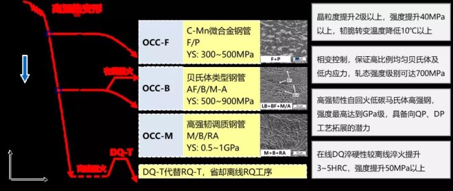 在產品方面,首先圍繞量大面廣的結構管和低鋼級管線管產品,通過差異化的在線控冷工藝,解決了熱軋態組織粗大和不均勻的工藝難題,省去了離線正火工序,實現了工藝減量化。其次是針對中高鋼級的管線管產品,開發了低碳當量和低合金成本的全新鋼種,并通過在線淬火工藝替代了離線淬火處理,同時實現了工藝和合金的減量化。第三類產品是圍繞高強度無縫鋼管產品,在量大面廣的API套管方面,通過在線淬火替代離線淬火,不僅縮短了工藝流程,而且強度得到了明顯提升。特別是我們開發的高端抗硫套管產品,通過實施在線控冷以后,110ksi級抗硫管產品不僅省去了一道離線的調質處理,而且抗硫性能等關鍵指標還提升了10%,達到30MPa?m1/2以上,真正實現了工藝減量化和產品的性能高質化。從而,在總體上實現了典型無縫管產品基于在線組織調控的短流程生產及流程再造。